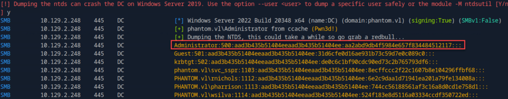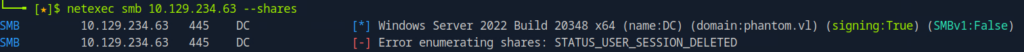 netexec smb 10.129.234.63 --sharesSMB 10.129.234.63 445 DC [*] Windows Server 2022 Build 20348 x64 (name:DC) (domain:phantom.vl) (signing:True) (SMBv1:False)