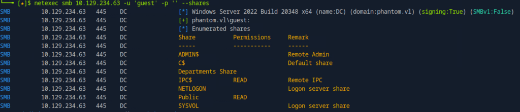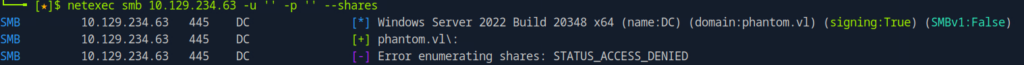 SMB 10.129.234.63 445 DC [] Windows Server 2022 Build 20348 x64 (name:DC) (domain:phantom.vl) (signing:True) (SMBv1:False) SMB 10.129.234.63 445 DC [+] phantom.vl\guest: SMB 10.129.234.63 445 DC [] Enumerated shares