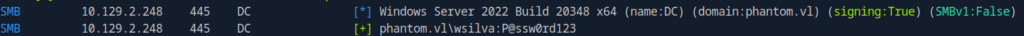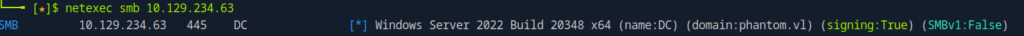 netexec smb 10.129.234.63SMB 10.129.234.63 445 DC [*] Windows Server 2022 Build 20348 x64 (name:DC) (domain:phantom.vl) (signing:True) (SMBv1:False)