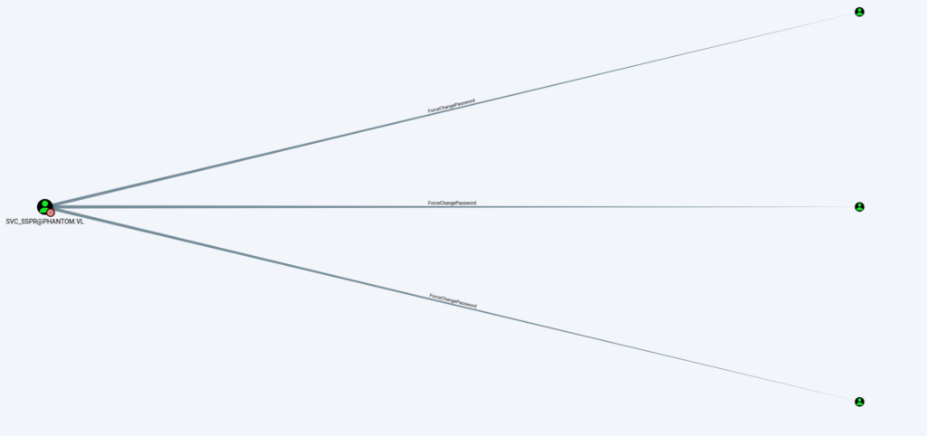 We can see that svc_sspr has ForceChangePassword control over crose, wsilva and rnichols by viewing the First Degree Object Control of the Outbound Control Rights.