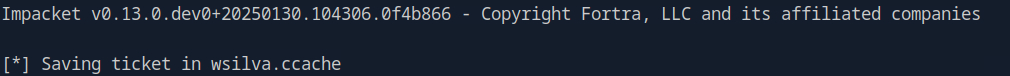 Then we request a TGT (Ticket Granting Ticket) for wsilva using getTGT.py, supplying this hash instead of the plaintext password.